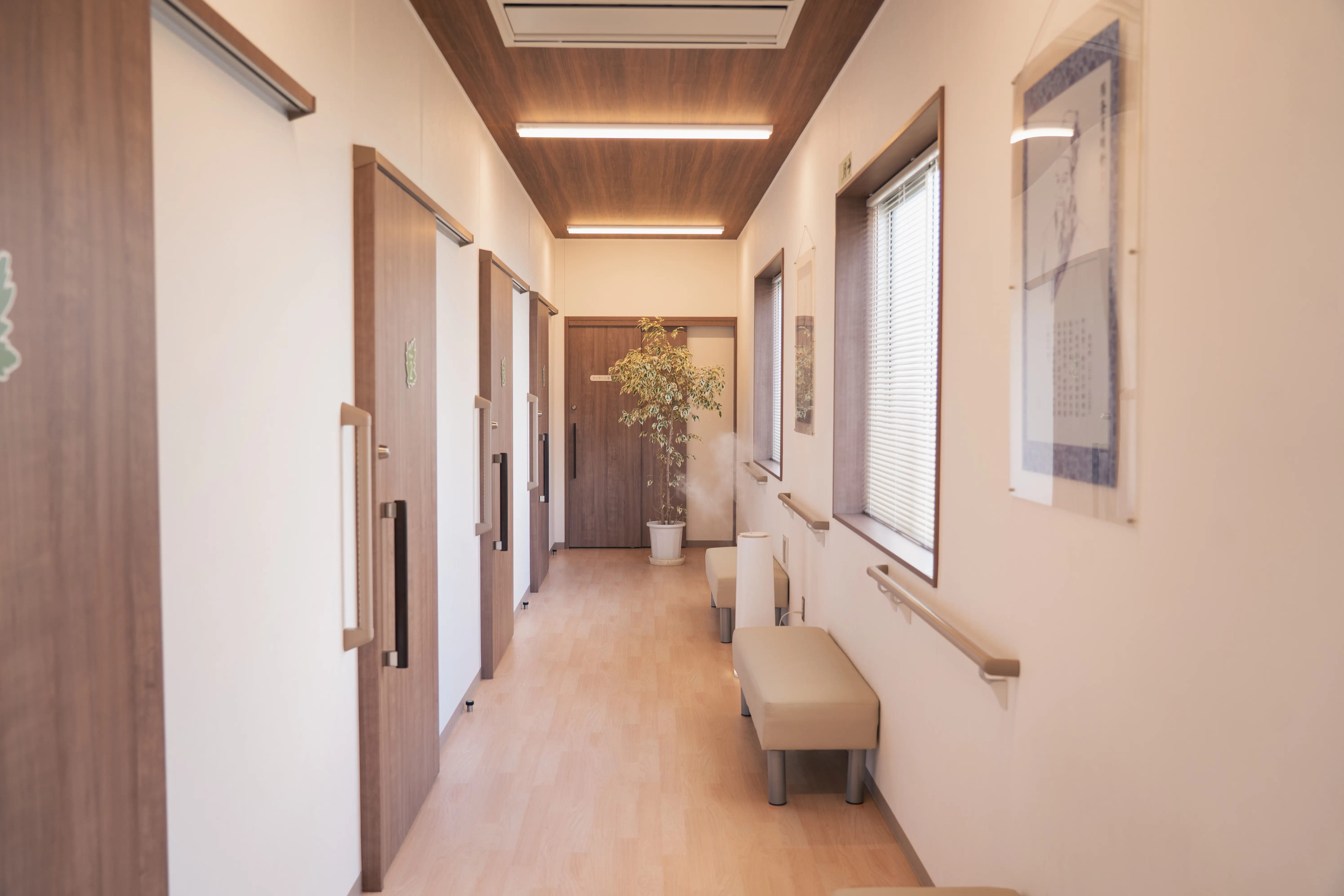 当院の施設内は、車いすをご利用の方にも安心してご来院いただけるよう、バリアフリー設計となっております。玄関・トイレ・治療室まで段差をなくし、移動しやすい環境を整えておりますので、どなたでも快適にご利用いただけます。